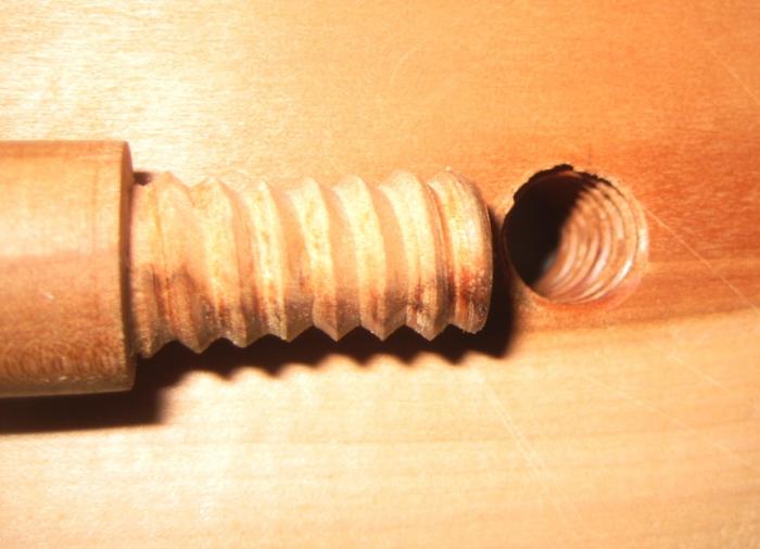 Die Jackenhalter wurden auf einer Bohrmaschinendrechselbank (Höllenlärm!) ohne Vorlage einfach drauflos gedrechselt. In eine ½-Bohrung wurde ein zuvor geschnittenes Gewinde mit Sockel eingeklebt und mit einem dünnen Schaschlikstäbchen gegen Verdrehen verdübelt.