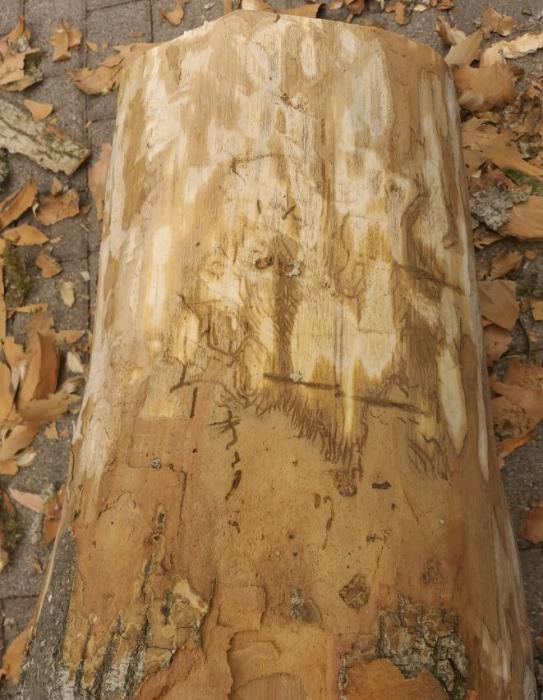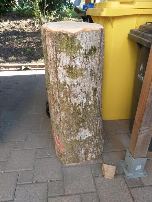 der Spaltklotz steht trocken unter einem Dach im Freien. Es haben sich mittlerweile deutliche Risse gebildet. Ich habe entschieden die Rind zu entfernen und es haben sich auch direkt Fraßspuren gezeigt.