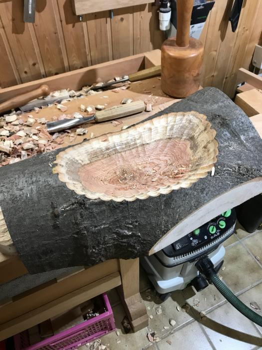 Dann habe ich mir eine der beiden Hälften ausgesucht und ohne vorheriges Anzeichnen einer Form (z.B. Kreis oder Ellipse) die Vertiefung ins nasse Holz geschlagen: