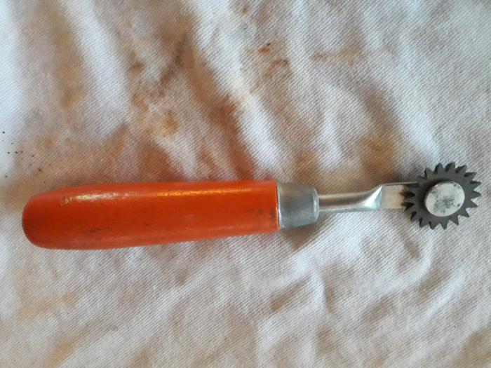 in einem kleinen Kästchen mit Kleinwerkzeugen zur Holzbearbeitung fand ich auch das abgebildete Werkzeug. Ich kenne solche Sternrädchen zum Übertragen von Schnittmustern, nicht aber aus der Holzwerkstatt.