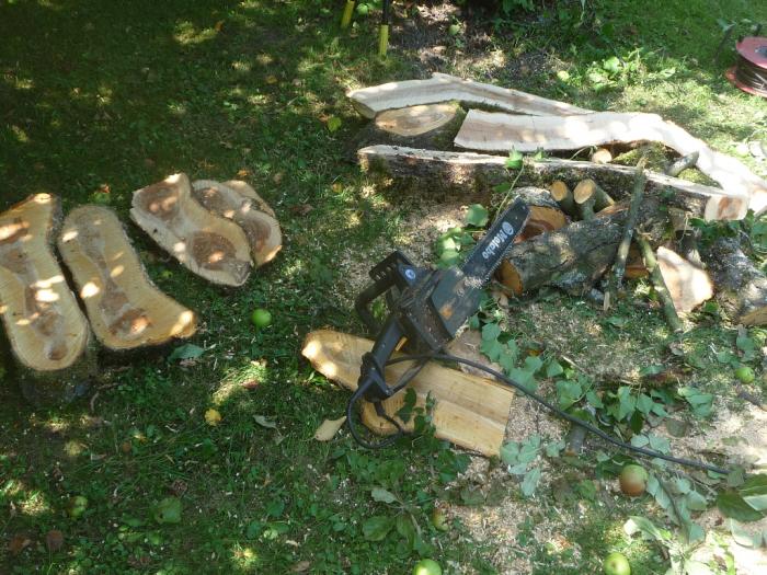 Gestern Morgen beim ersten Blick in den Garten stellte ich fest, dass an einem älteren Apfelbaum ein starker Ast abgebrochen war, mein Sohn und ich gingen dann während der Mittagshitze daran den Ast klein zu schneiden und die Spuren zu beseitigen.
