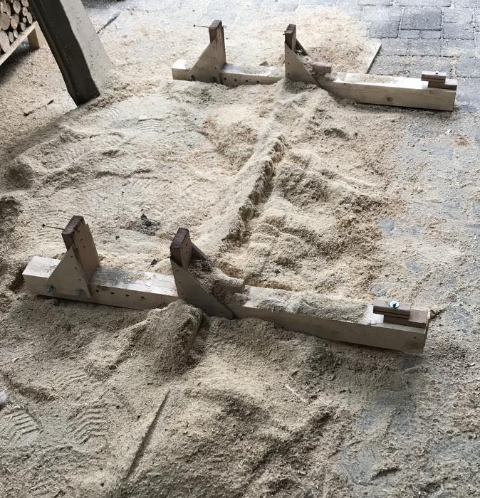 Der Stamm liegt ebenfalls auf den Kanthölzern und wird durch je zwei "Bücherstützen" mittels Spax-Schrauben fixiert. Eine Seite ist verstellbar, je nach Stammstärke. Die Höhenverstellung (Einstellung der Brettstärke) erfolgt durch Unterlegen von jeweils 4 cm dicken Holzstücken (4 cm = Brutto-Brettstärke). Die Netto-Brettstärke beträgt bei der 4 cm dicken Unterlage etwa 3 cm.