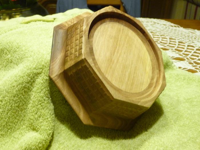 Als ich mit dem Umbau fertig war, wollte ich natürlich gleich mal etwas fertigen, bei dem ich die neuen Möglichkeiten ausnutzen konnte, also wieder eine kleine Schale, dieses Mal acht Ecken, die Schräge seitlich mit der schräg gestellten Einheit innen und außen, die kleinen Verzierungen waren auch so möglich.