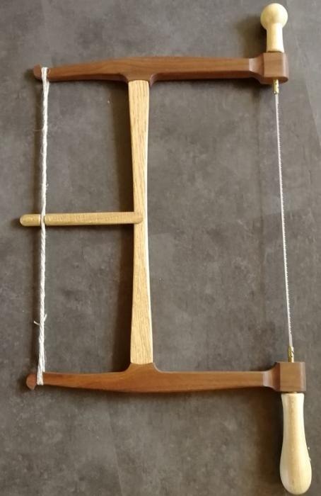 Die Sägearme sind aus amerikanischem Nussbaum, der Steg und der Stab zum verdrillen aus Eiche und die Hörnchen aus Ahorn.